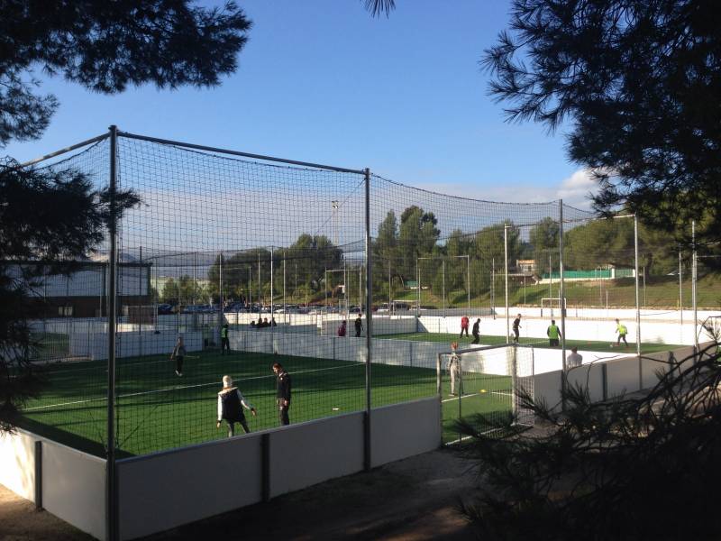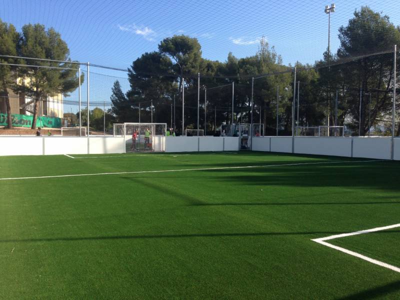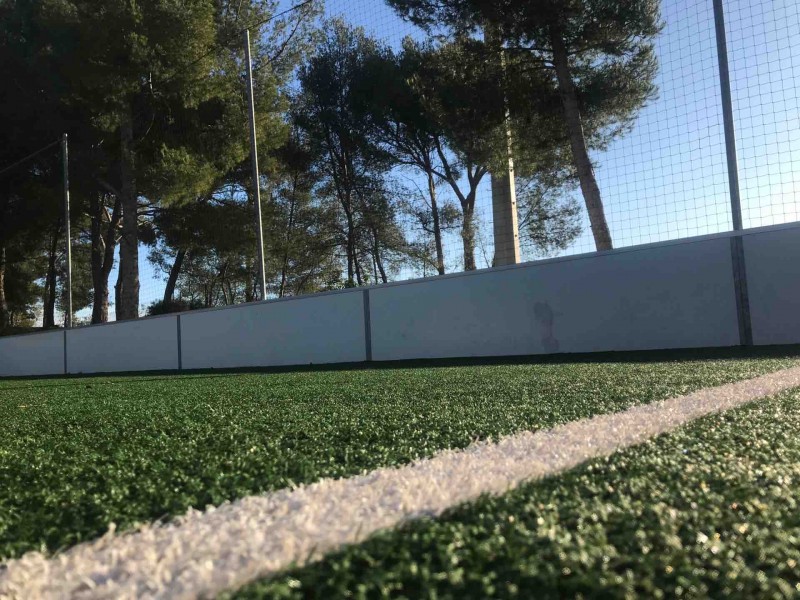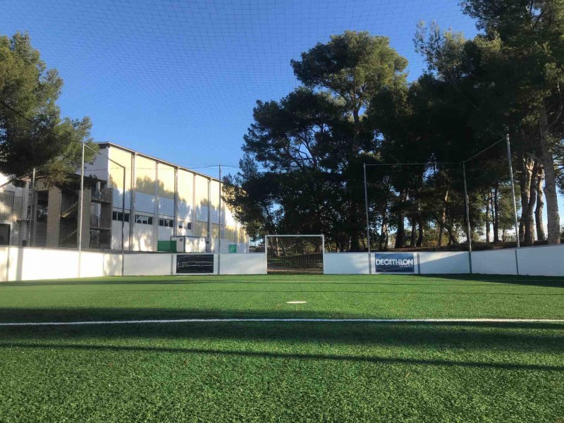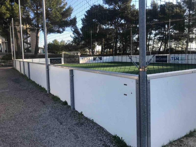 Après une préparation du fond de forme pour obtenir une planimétrie conforme aux exigences, nos équipes ont installé les pare-ballons, les panneaux sandwichs, les buts et enfin les gazons synthétiques de 35mm.