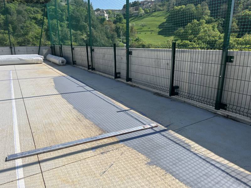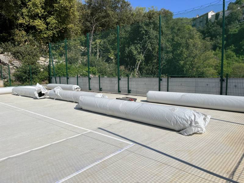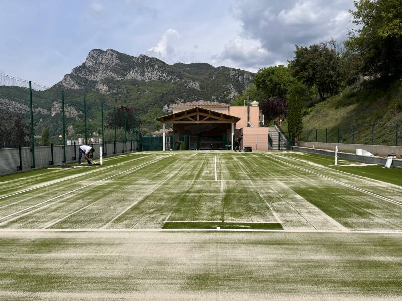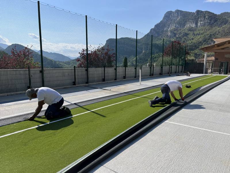Plusieurs étapes ont été nécessaires à l'aboutissement de ce projet dans l'arrière pays des Alpes Maritimes. En premier lieu le béton a été nettoyé au nettoyeur haute pression ; puis nous avons repris quelques flaches (creux formés par l'usure). Le gazon synthétique a été posé par les équipes qui, une fois les tracés faits, ont lesté le support grâce au sable spécifique à cet usage.